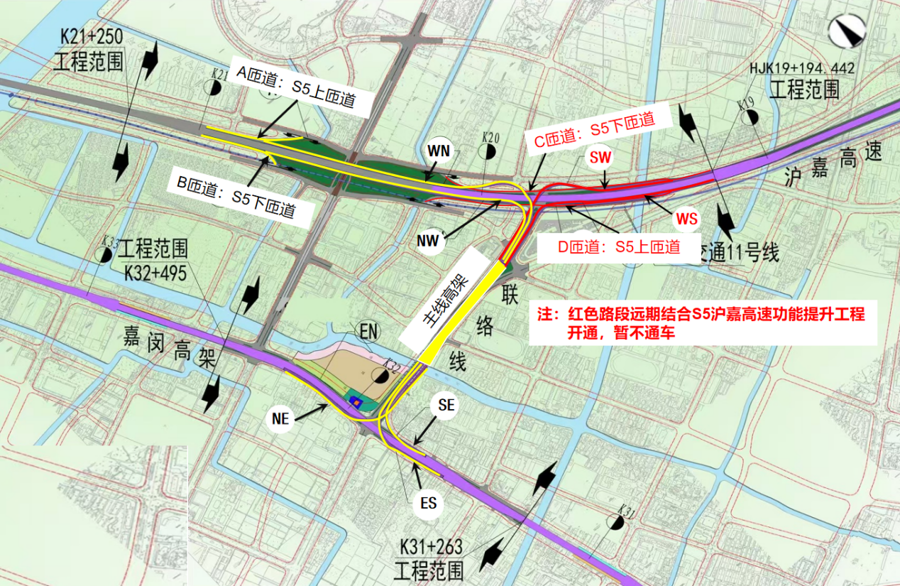 其中,主线采用双向6车道,地面辅路为双向4至6车道。注意,沪嘉高速立交WS和SW匝道因需与沪嘉高速功能提升工程同步实施,暂不开通。