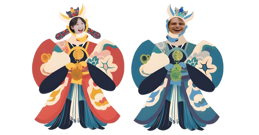 展览特别设置了数字艺术剧场,展映了四部由上海戏剧学院师生创作的AI视频作品,令人颇感“惊艳”。其中《春节序曲》以李焕之经典乐曲为基调,通过AI算法将七位艺术家的画作动态化,重构红绸、驼铃、远帆等意象,展现千年文明的时间脉络。《东韵西行》巧妙融合柴可夫斯基《西班牙舞曲》与江南水墨服饰,让东方纹样在弗拉明戈节奏中舞动,诠释“和而不同”的对话精神。《丝带联结中国和西班牙》以航拍视角串联长城与阿尔罕布拉宫等地标,通过AI技术让柔韧的丝带舞动于苍穹之间,织就一场文明的对话。《共舞·未来》通过机器人舞步与戏曲吟唱的跨时空对话,凸显科技与人文的共生愿景,寓意人类在文化互鉴中迈向共同未来。