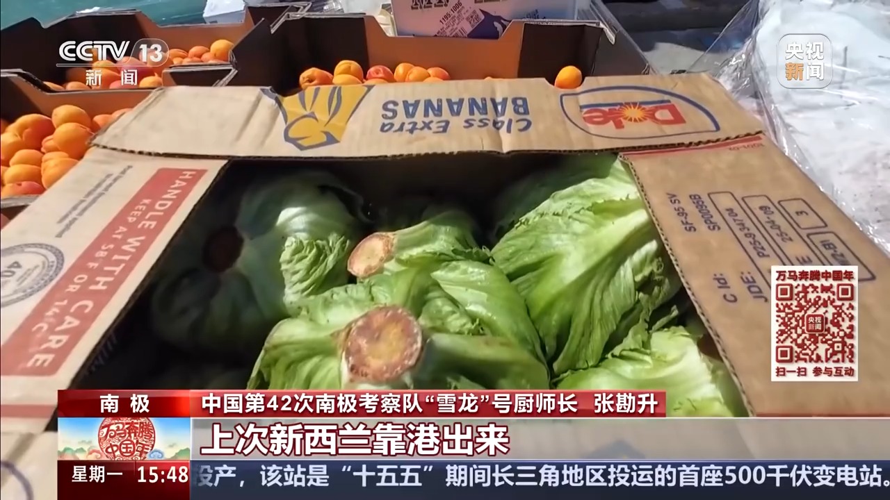 中国第42次南极考察队“雪龙”号厨师长 张勘升:今年特意准备了香菇菜心。这个青菜,上次新西兰靠港出来,留了几箱一直没舍得用,就是准备年夜饭用的。