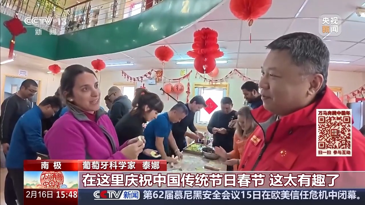中山站上,大家一起写春联、贴年画,还准备了舞狮、唱歌等联欢节目。刚刚开通了通信基站的秦岭站,队员们不仅可以打电话、收发短信,还可以和家人朋友视频拜年了。长城站上,几名正在长城站开展科研活动的葡萄牙科学家,同中国考察队员一起包饺子,迎接中国农历春节。